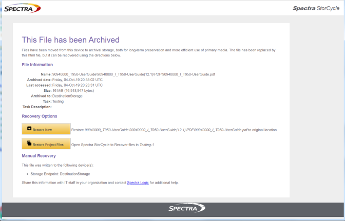 Click Restore Now to restore the individual file or Restore Project Files to restore all files in the Migrate / Store project. The Spectra StorCycle Solution login screen displays.
